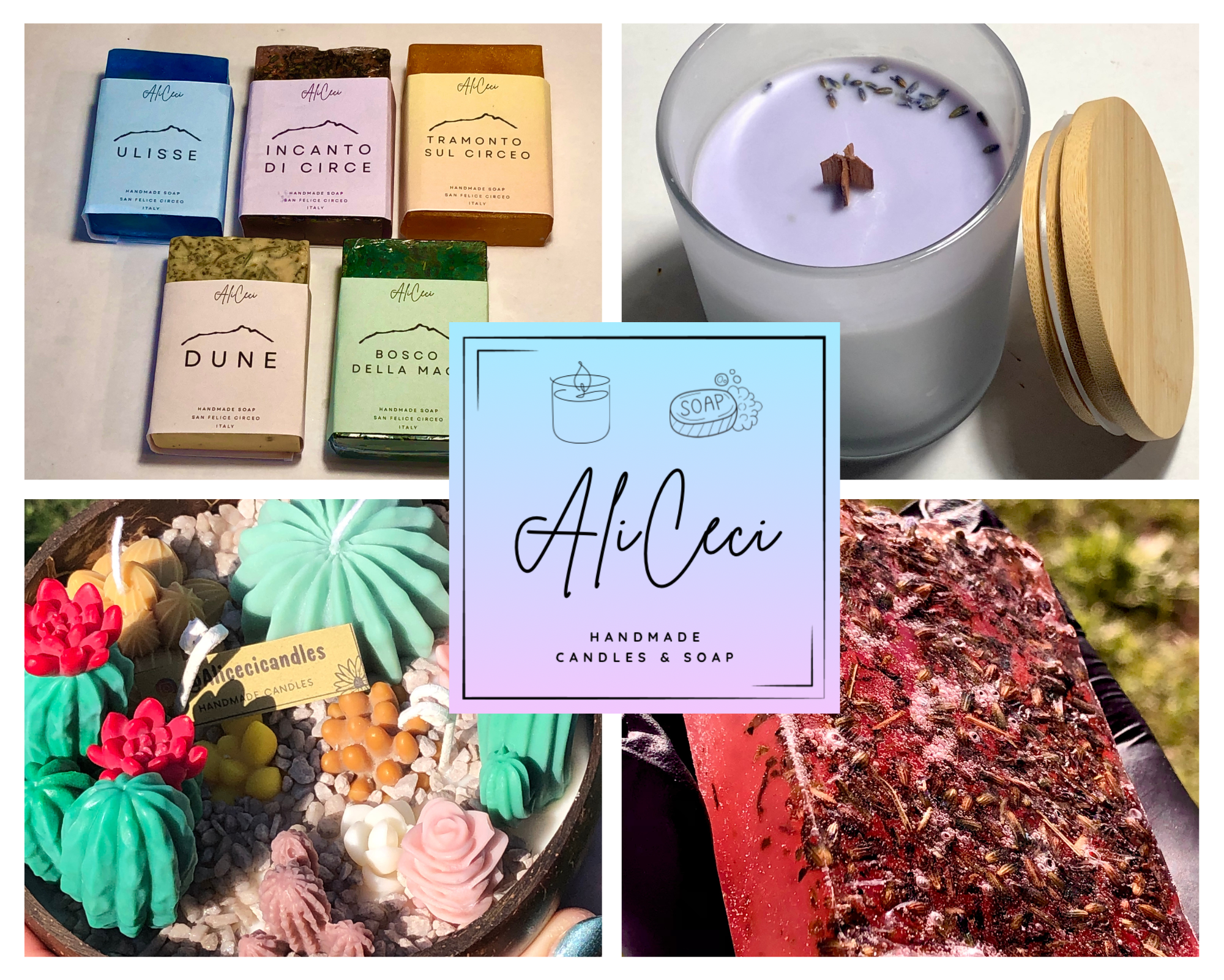 Le nostre candele e i nostri saponi artigianali sono creati a mano con amore e cura in ogni dettaglio, utilizzando solo prodotti 100% naturali , cere e basi sapone di alta qualita’ , coloranti edibili e non semplicemente fragranze aromatiche , ma oli essenziali certificati bio, per garantire profumi autentici e tutte le proprieta' benefiche che solo oli essenziali puri possono garantire.